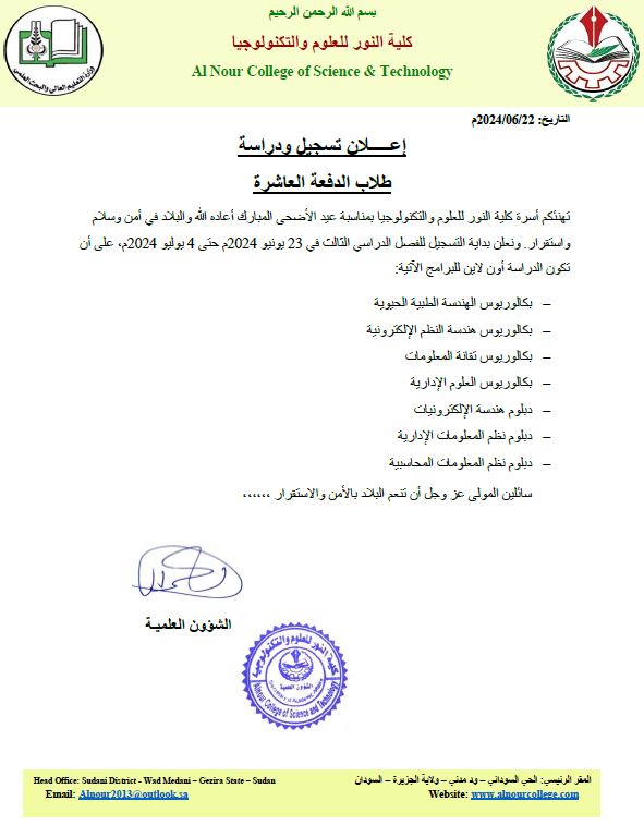 تـنـويـــــه تنوه أمانة الشؤون العلمية الخريجين الذين تقدموا بطلب استخراج شهادات جامعية في الفترة من 11 مايو 2024م حتى 1 يونيو 2024، بأن الشهادات جاهزة للاستلام بمكتب الكلية بمدينة دنقلا – حي الدرجة الثانية جوار مصنع الثلج. للتواصل تلفون: 00249902038250